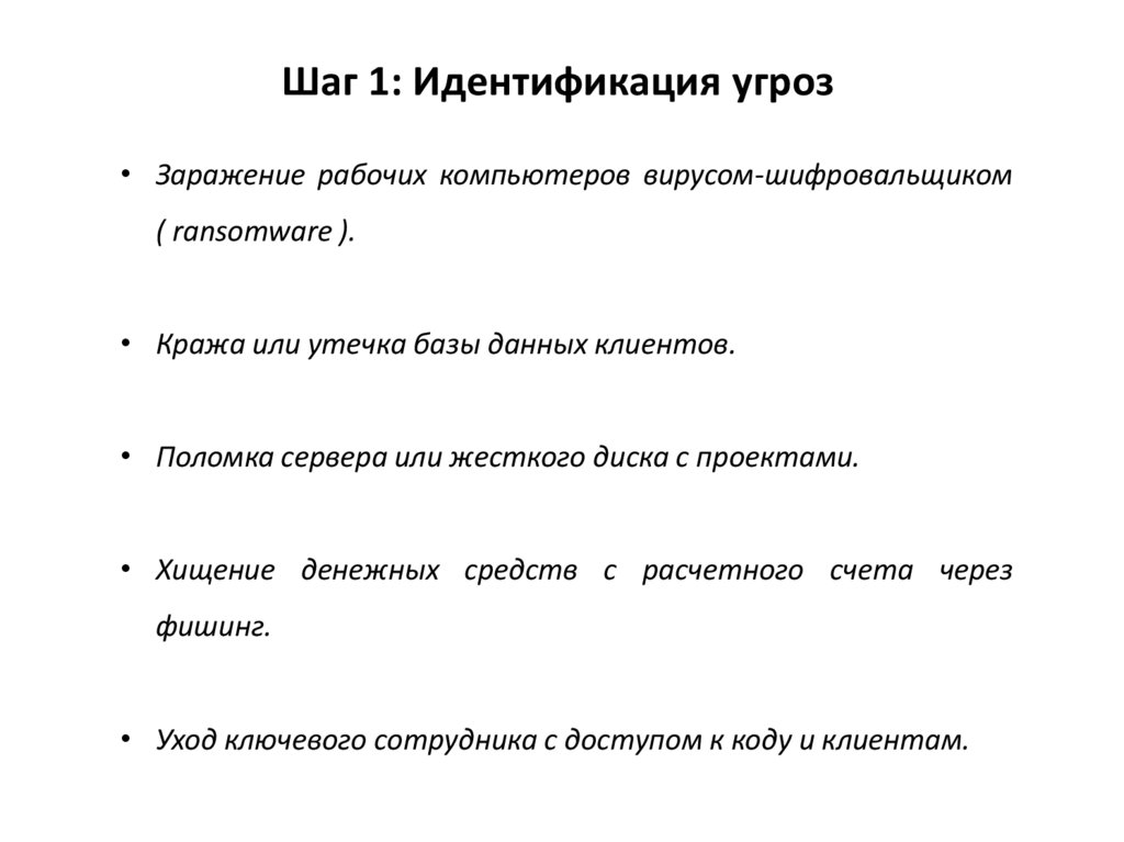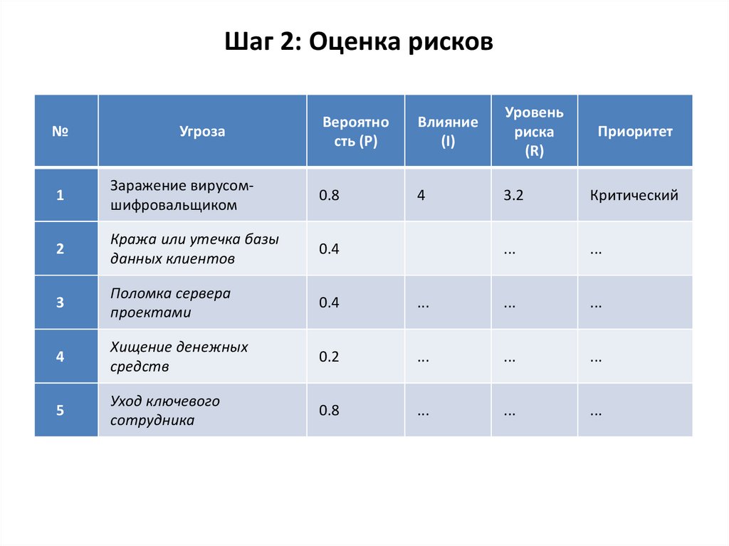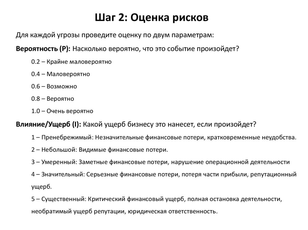 Шаг 2: Оценка рисковДля каждой угрозы проведите оценку по двум параметрам: