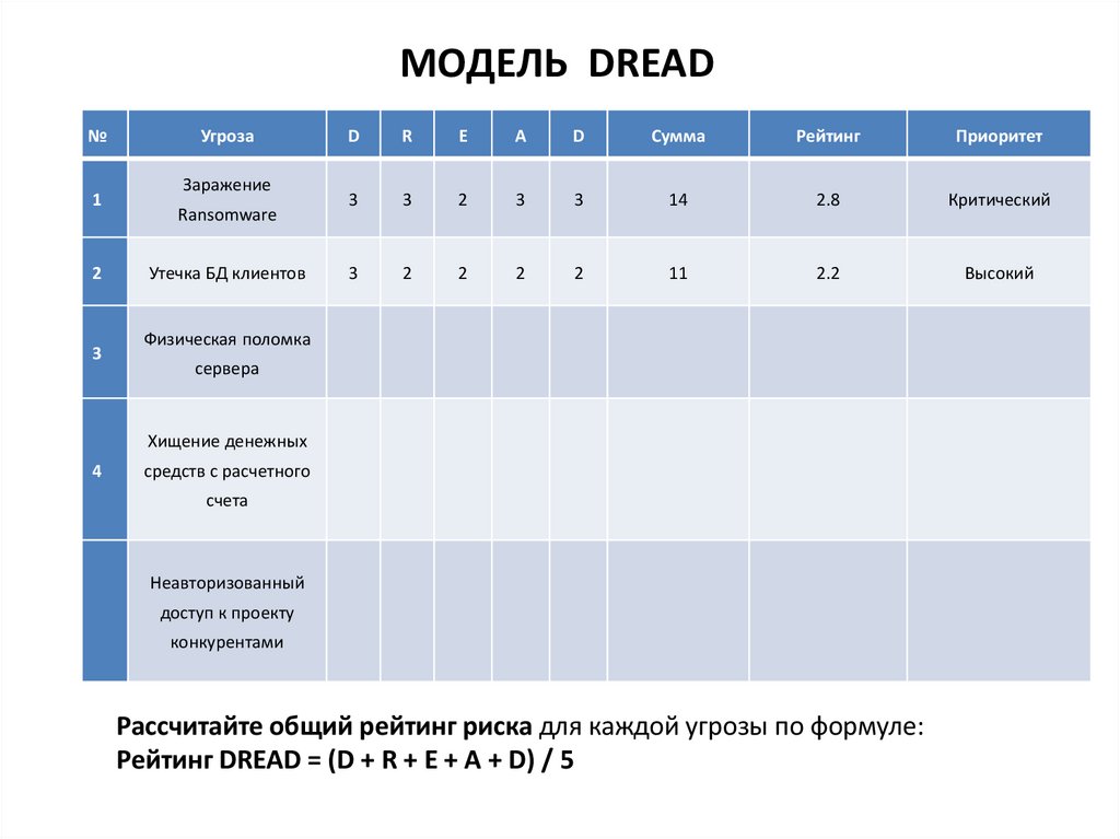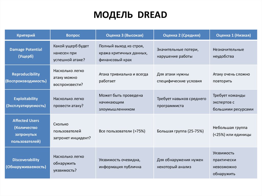 Рейтинг DREAD = (D + R + E + A + D) / 5
