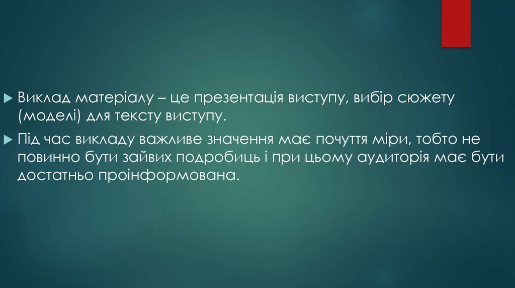 Виклад матеріалу – це презентація виступу, вибір сюжету(моделі) для тексту виступу.