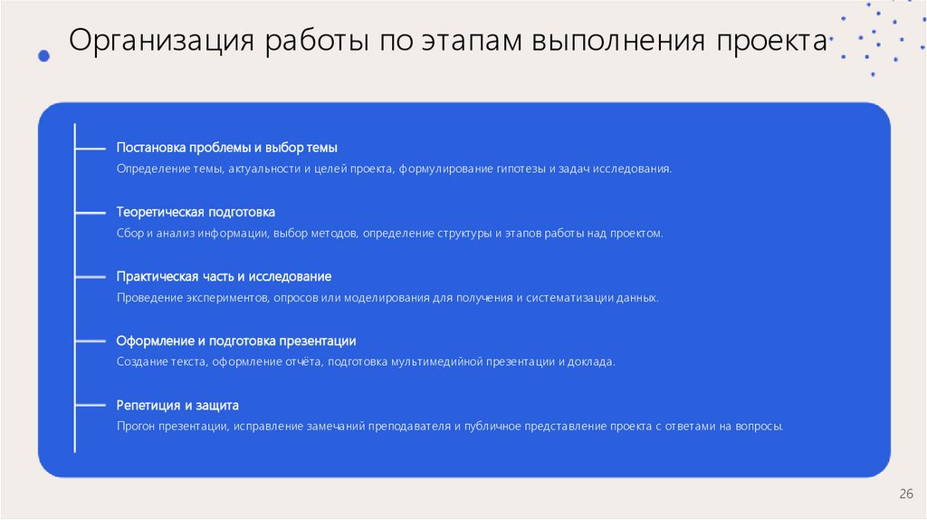 Организация работы по этапам выполнения проектаПостановка проблемы и выбор темы