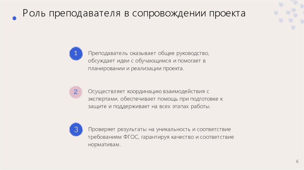 Роль преподавателя в сопровождении проектаПреподаватель оказывает общее руководство,