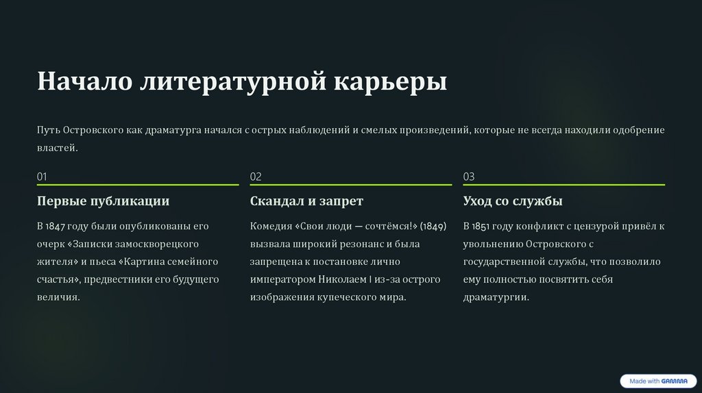 Начало литературной карьерыПуть Островского как драматурга начался с острых наблюдений и смелых произведений, которые не всегда находили одобрение