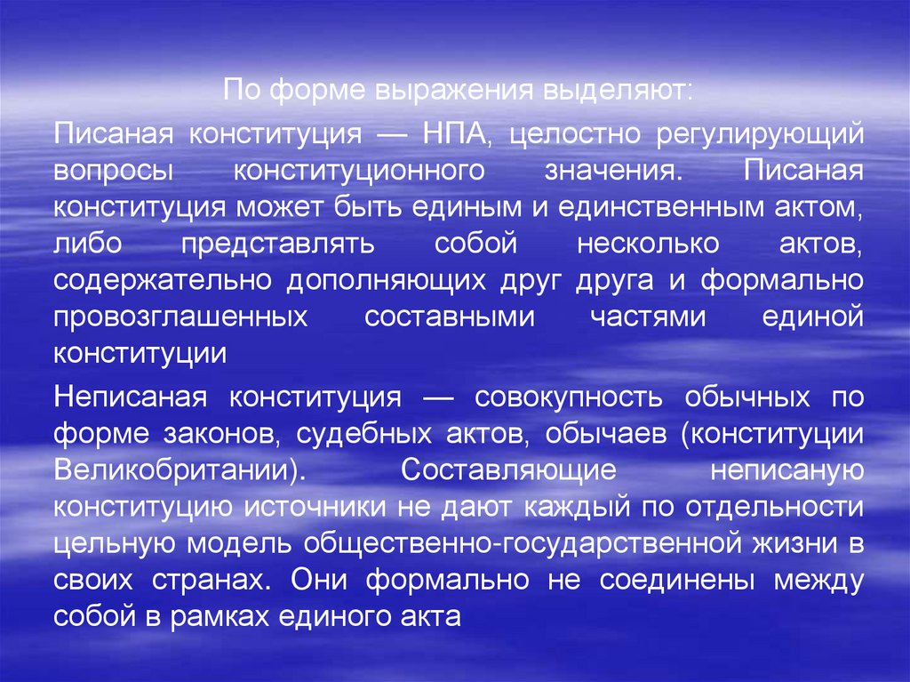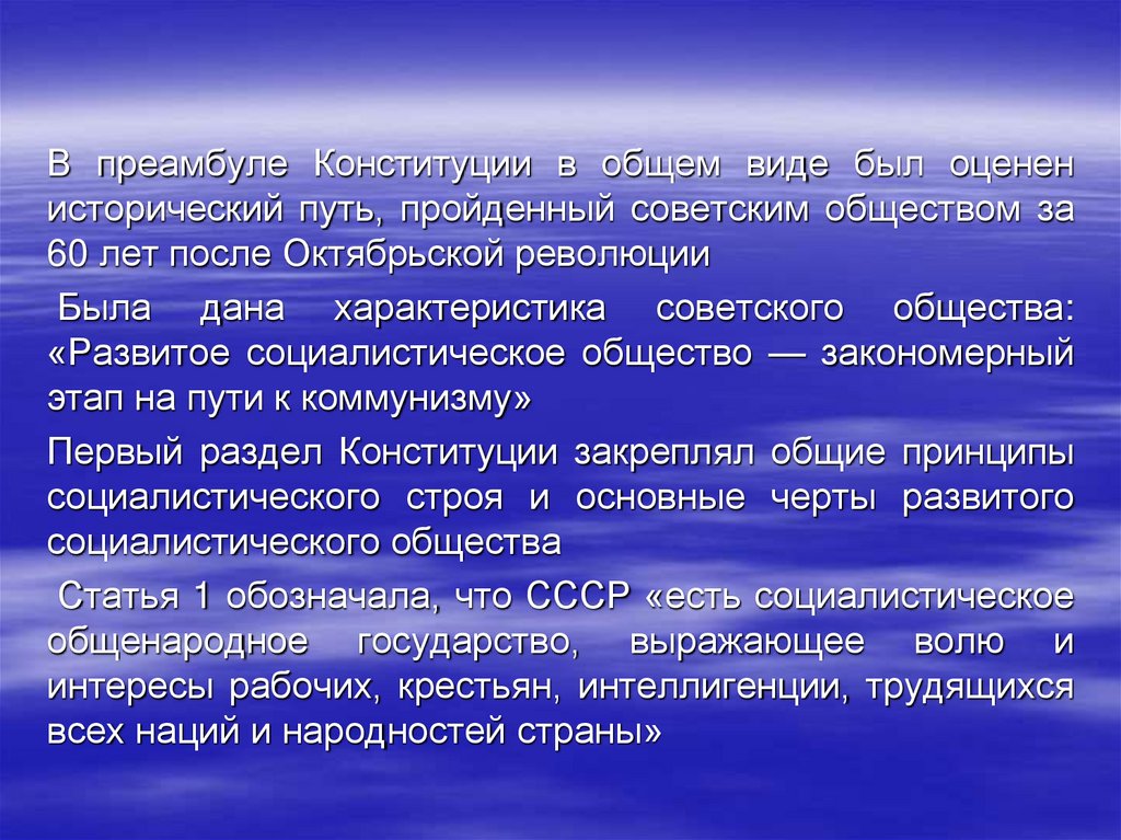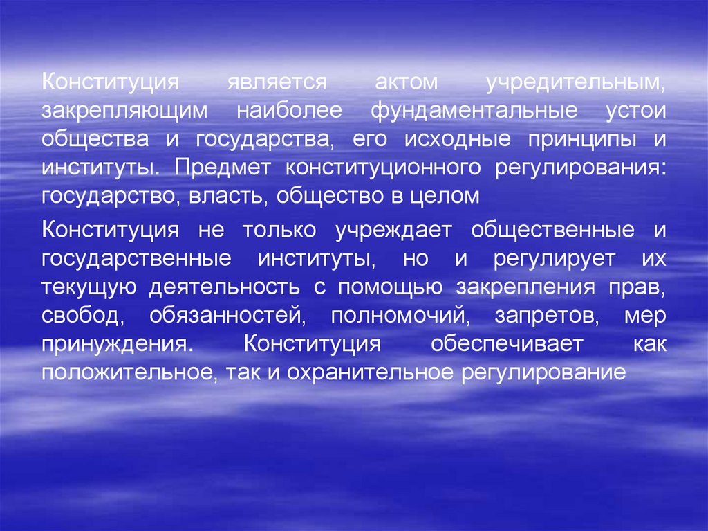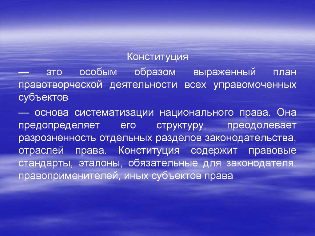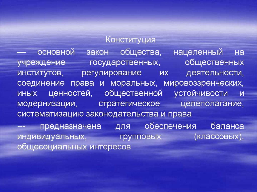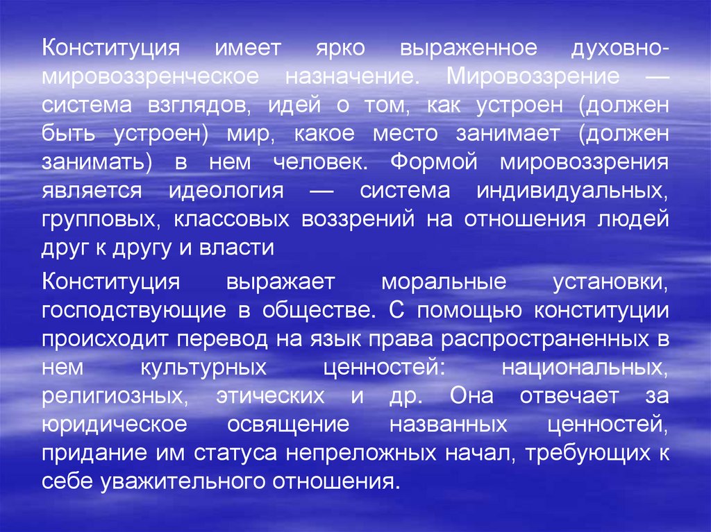 Конституция имеет ярко выраженное духовномировоззренческое назначение. Мировоззрение —система взглядов, идей о том, как устроен (должен