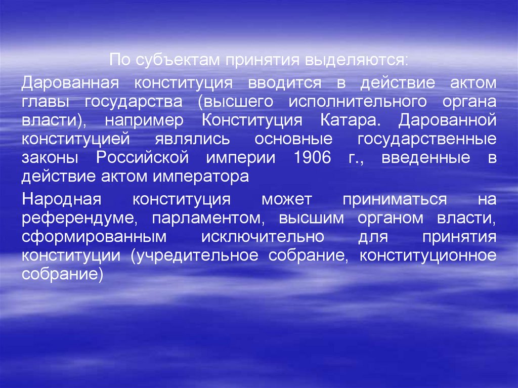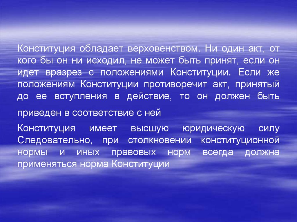 Конституция обладает верховенством. Ни один акт, откого бы он ни исходил, не может быть принят, если он