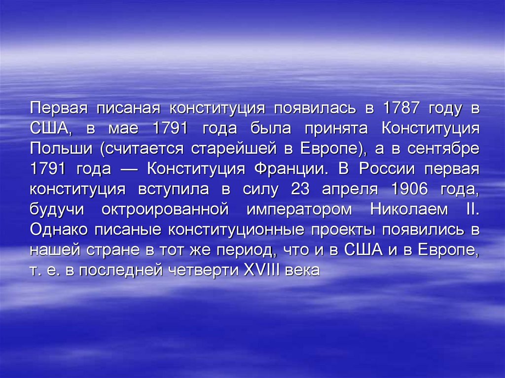 Первая писаная конституция появилась в 1787 году вСША, в мае 1791 года была принята Конституция