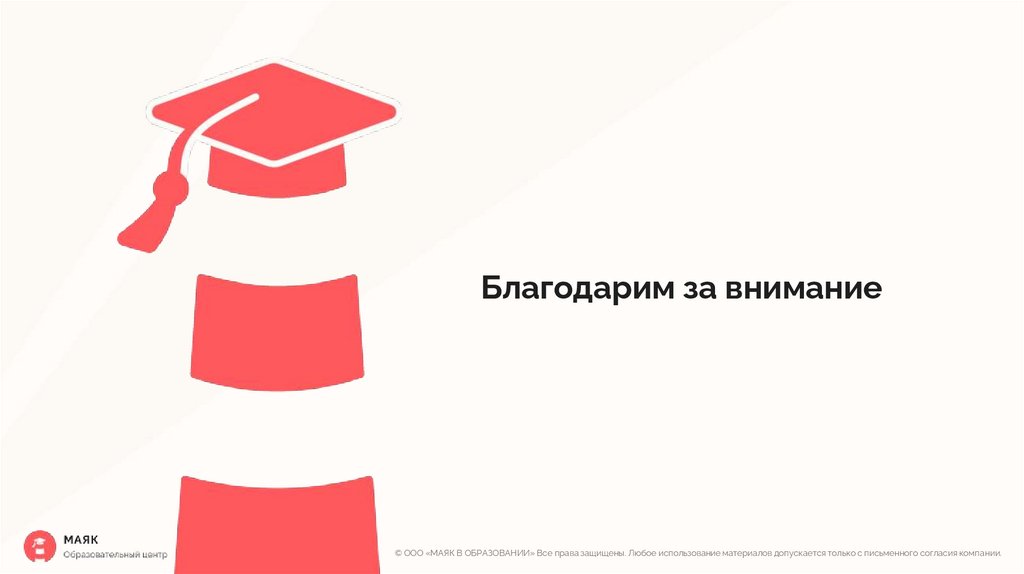 Благодарим за внимание© ООО «МАЯК В ОБРАЗОВАНИИ» Все права защищены. Любое использование материалов допускается только с письменного согласия компании.