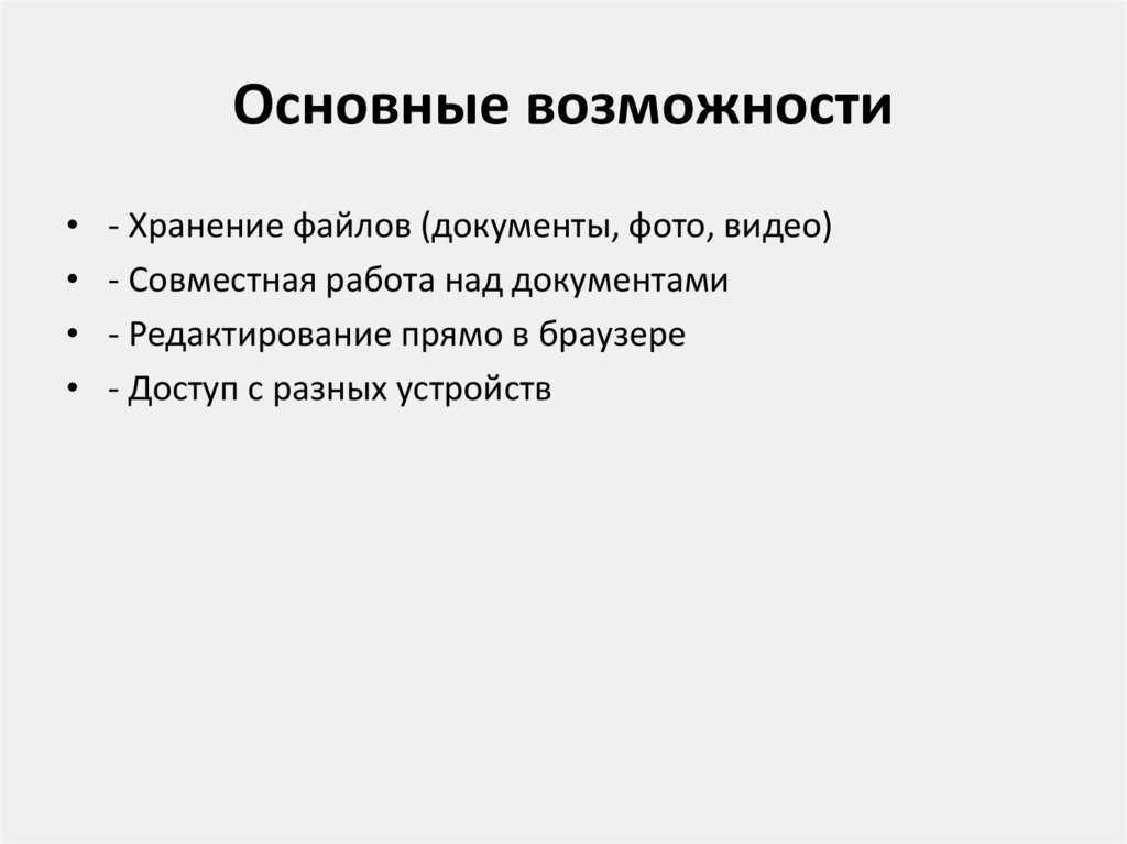 Основные возможности- Хранение файлов (документы, фото, видео)