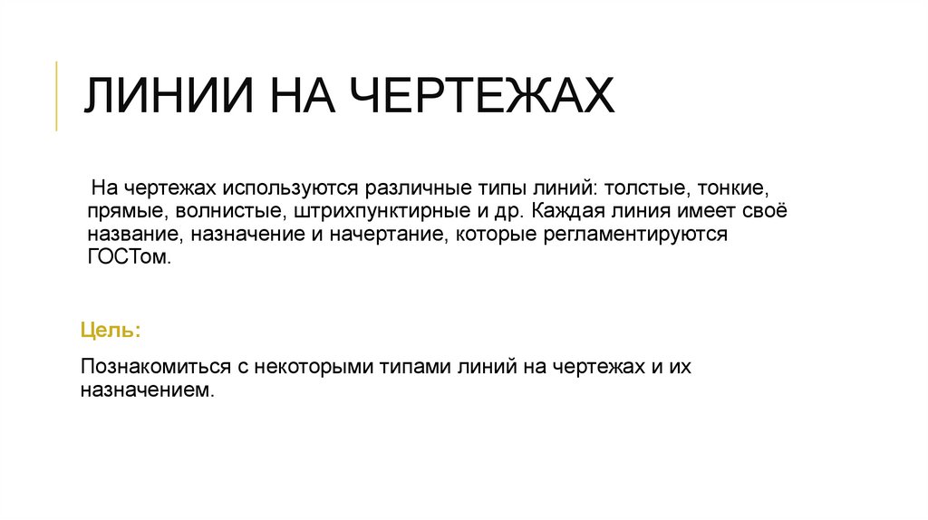 ЛИНИИ НА ЧЕРТЕЖАХНа чертежах используются различные типы линий: толстые, тонкие,