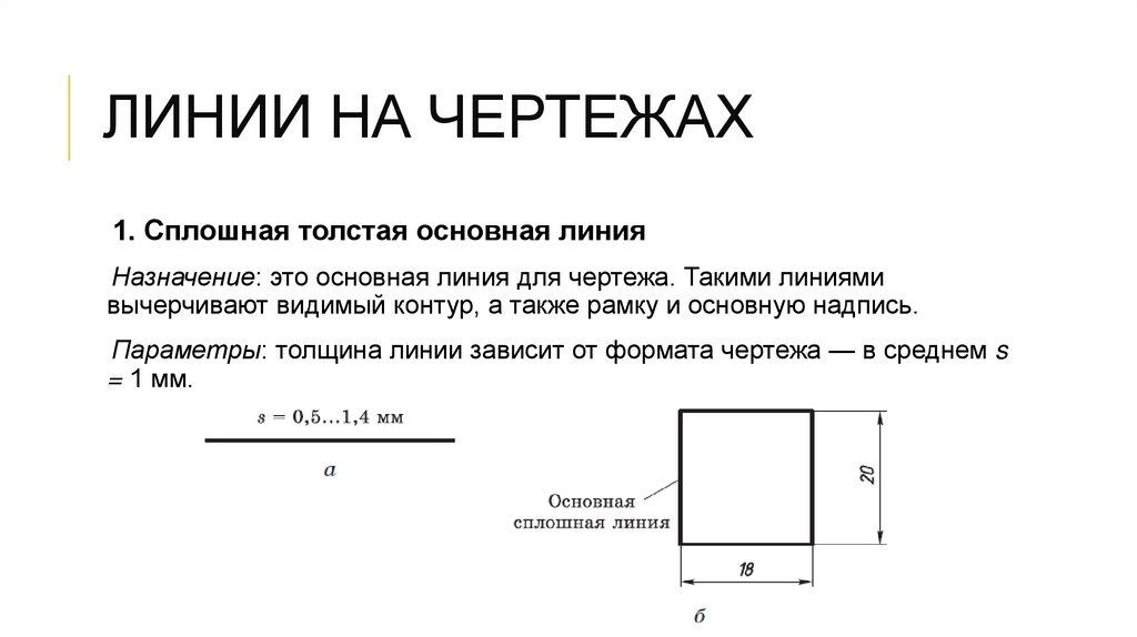 ЛИНИИ НА ЧЕРТЕЖАХ1. Сплошная толстая основная линия