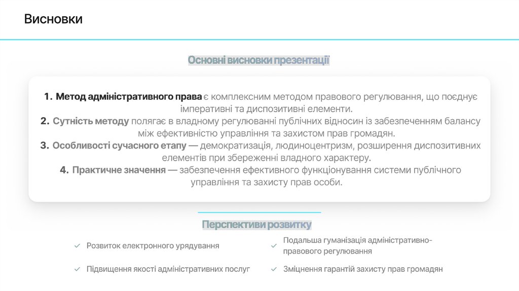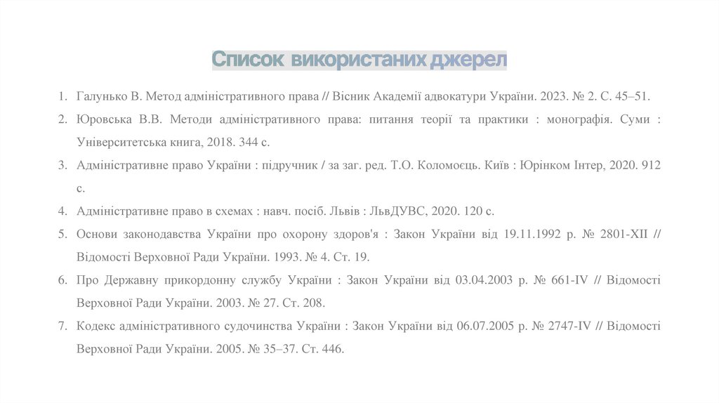 1. Галунько В. Метод адміністративного права // Вісник Академії адвокатури України. 2023. № 2. С. 45–51.2. Юровська В.В. Методи адміністративного права: питання теорії та практики : монографія. Суми :