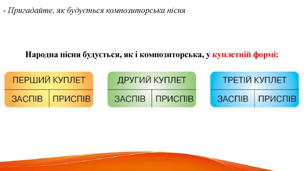 - Пригадайте, як будується композиторська пісня.Народна пісня будується, як і композиторська, у куплетній формі:
