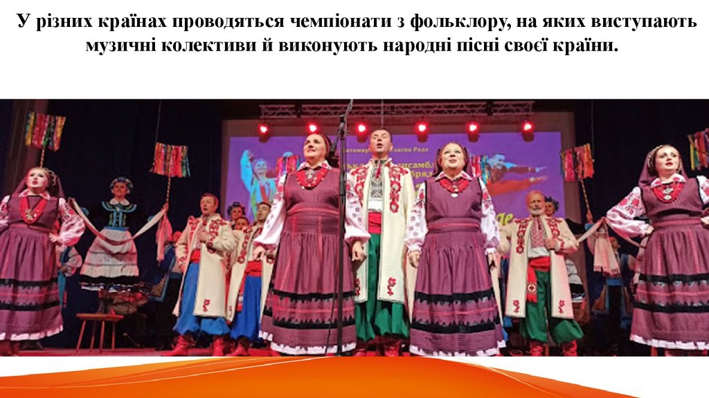 У різних країнах проводяться чемпіонати з фольклору, на яких виступаютьмузичні колективи й виконують народні пісні своєї країни.