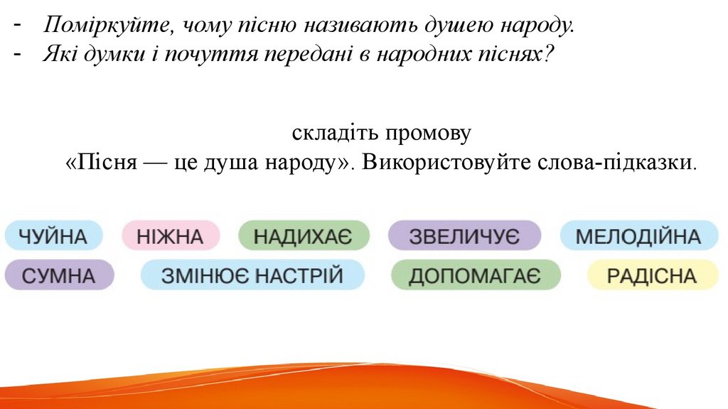 «Пісня — це душа народу». Використовуйте слова-підказки.