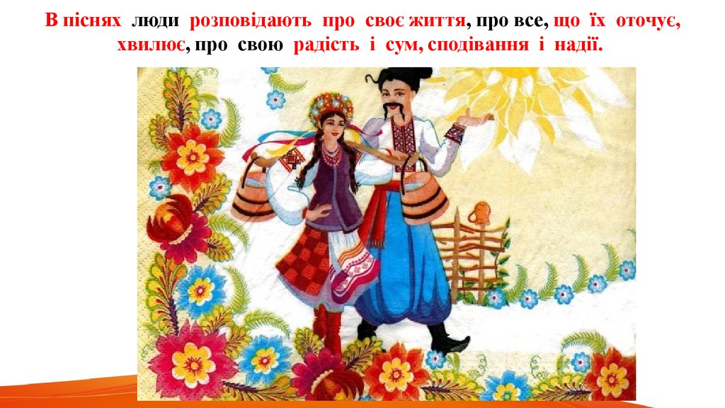 В піснях люди розповідають про своє життя, про все, що їх оточує,хвилює, про свою радість і сум, сподівання і надії.