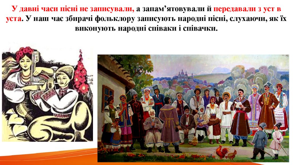 У давні часи пісні не записували, а запам’ятовували й передавали з уст вуста. У наш час збирачі фольклору записують народні пісні, слухаючи, як їх