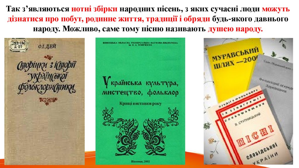 Так з’являються нотні збірки народних пісень, з яких сучасні люди можутьдізнатися про побут, родинне життя, традиції і обряди будь-якого давнього