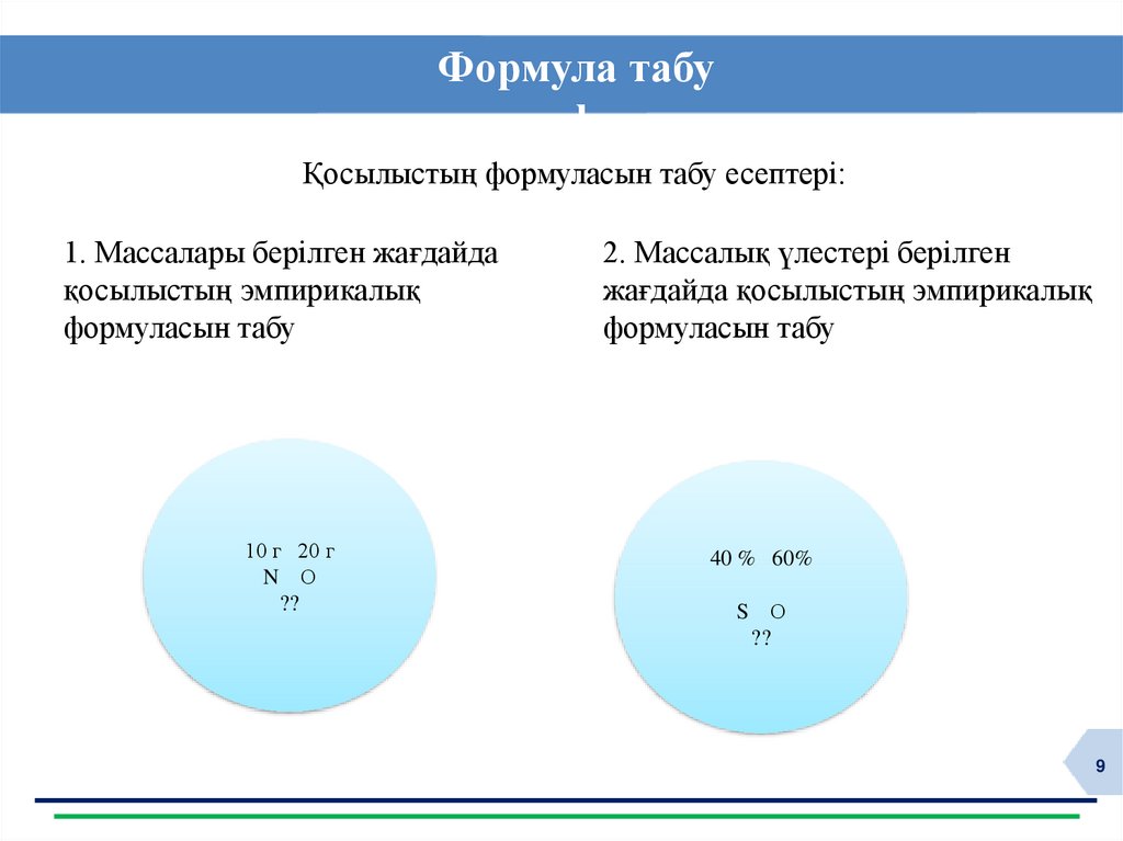 Қосылыстардағы элементтердің массалық үлесін анықтау.