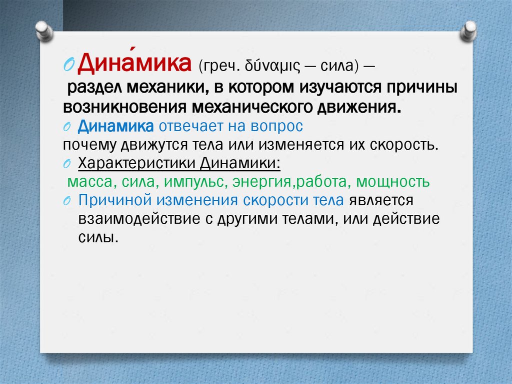 O Дина́мика (греч. δύναμις — сила) —раздел механики, в котором изучаются причины
