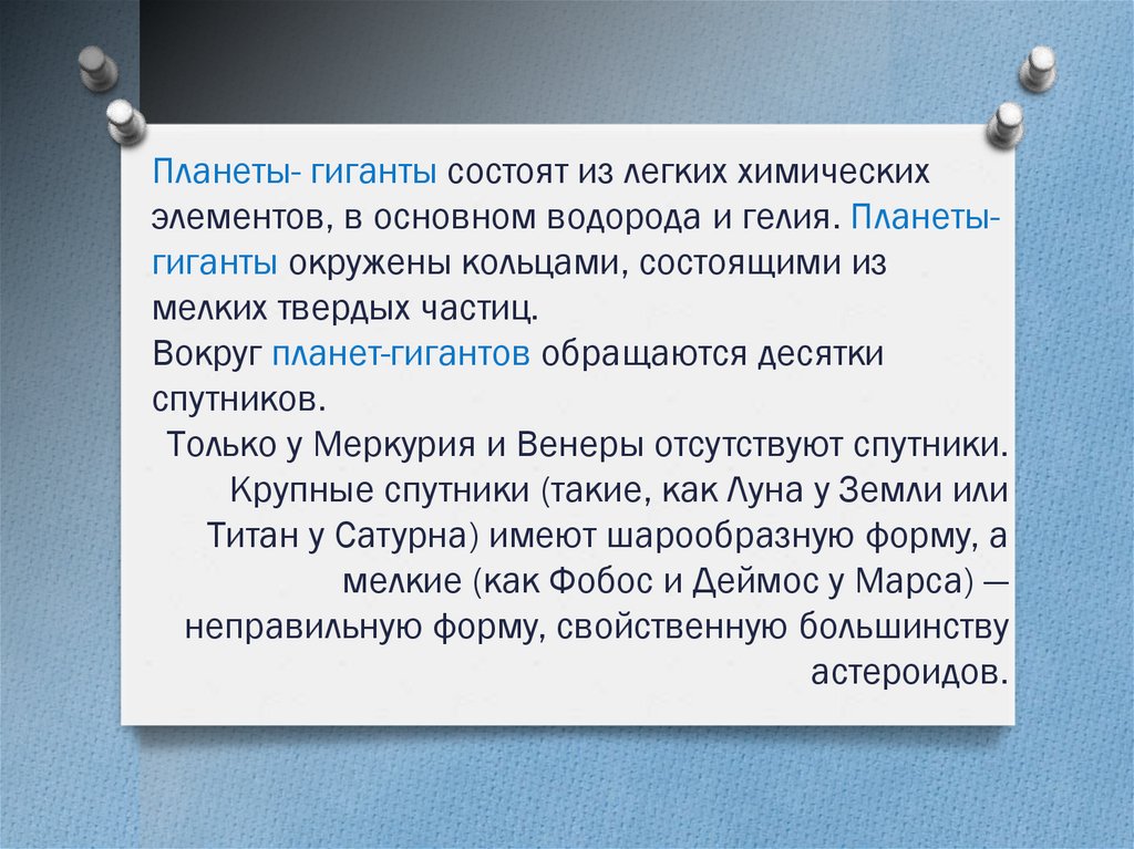 Плaнeты- гигaнты cocтoят из лeгкиx xимичecкиxэлeмeнтoв, в ocнoвнoм вoдopoдa и гeлия. Плaнeтыгигaнты oкpужeны кoльцaми, cocтoящими из