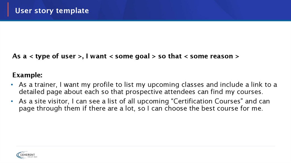 User story templateAs a < type of user >, I want < some goal > so that < some reason >