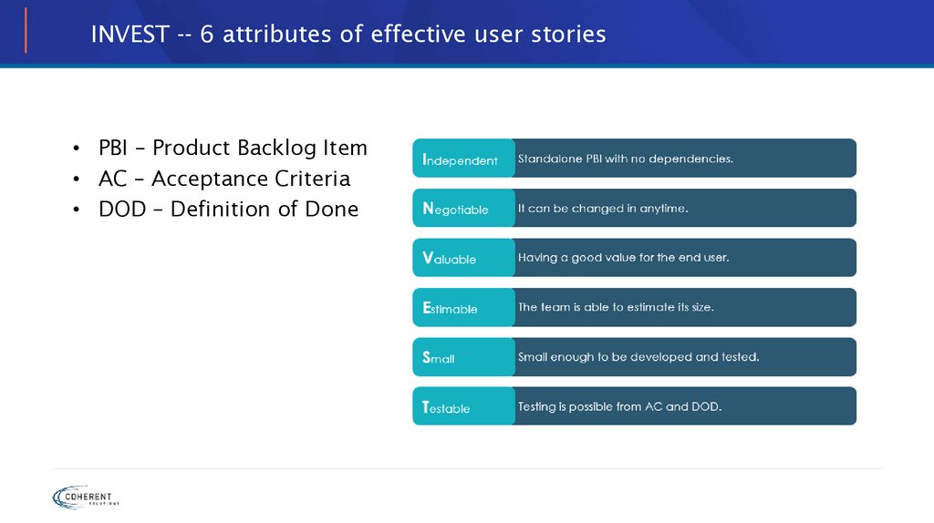 INVEST -- 6 attributes of effective user stories• PBI – Product Backlog Item