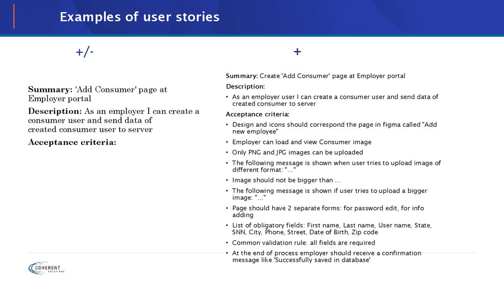 represent a full use case or scenario (e.g. As an admin, I want to be able to