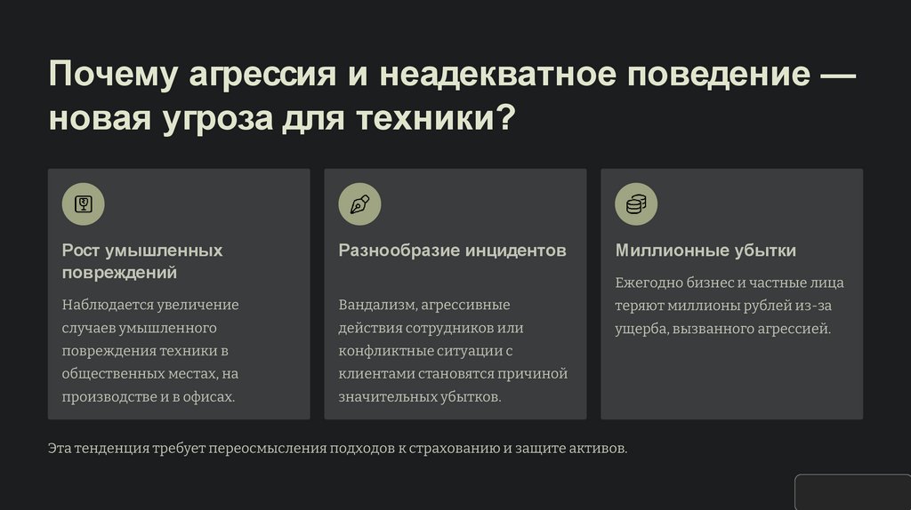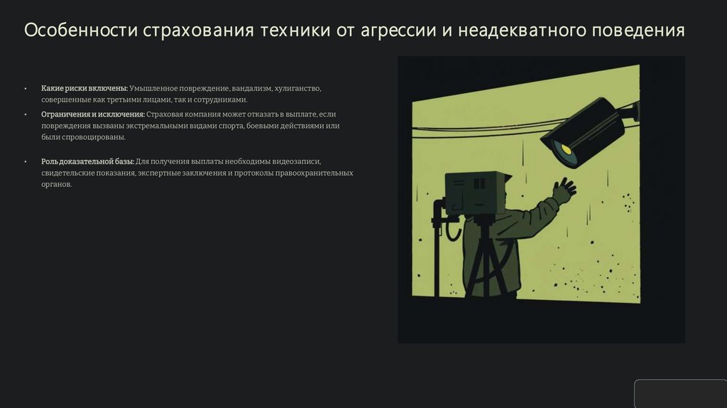 Особенности страхования тех ники от агрессии и неадекватного поведенияКакие риски включены: Умышленное повреждение, вандализм, хулиганство,