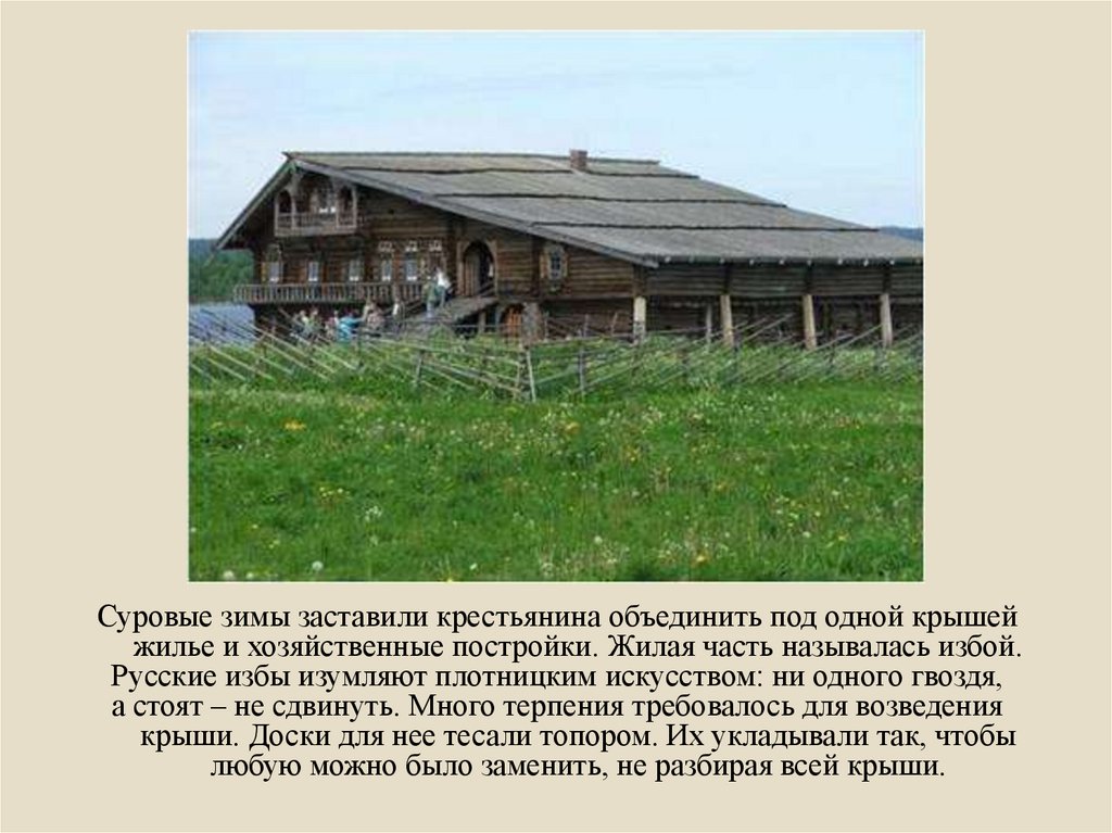 Суровые зимы заставили крестьянина объединить под одной крышейжилье и хозяйственные постройки. Жилая часть называлась избой.