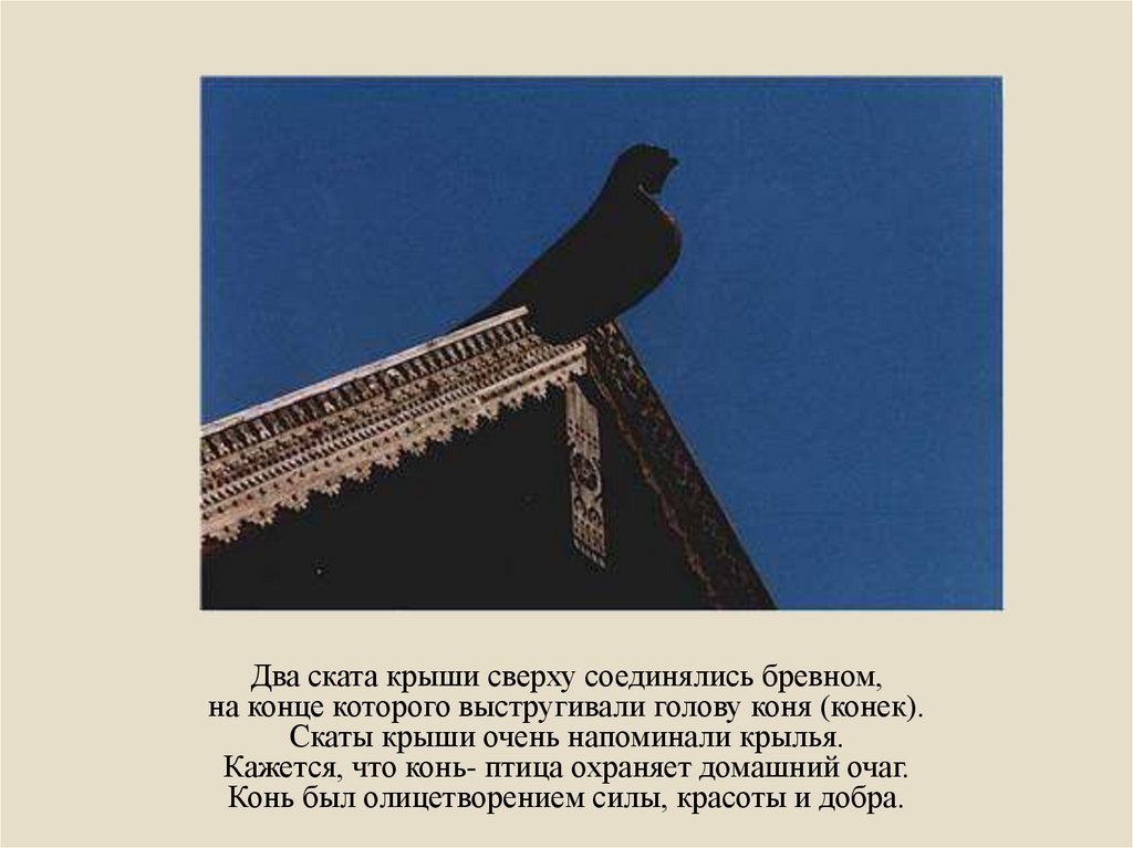 Два ската крыши сверху соединялись бревном,на конце которого выстругивали голову коня (конек).
