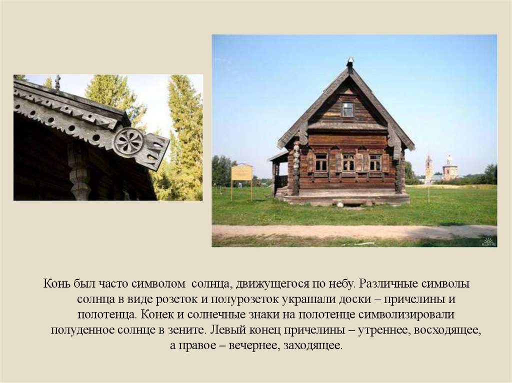 Конь был часто символом солнца, движущегося по небу. Различные символысолнца в виде розеток и полурозеток украшали доски – причелины и