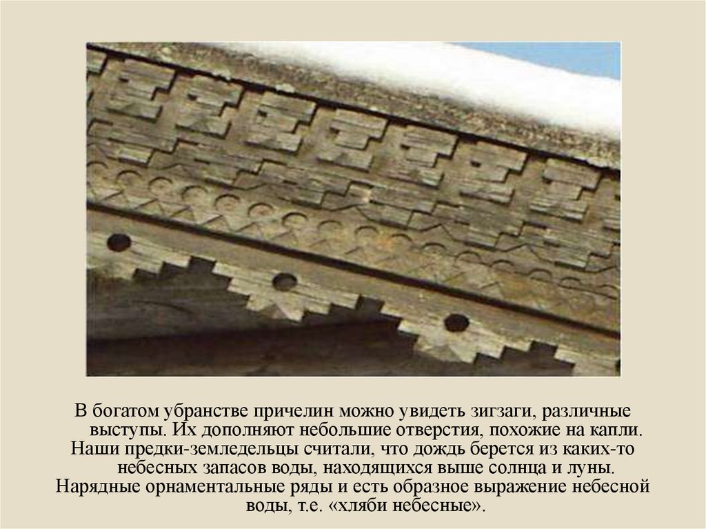 В богатом убранстве причелин можно увидеть зигзаги, различныевыступы. Их дополняют небольшие отверстия, похожие на капли.