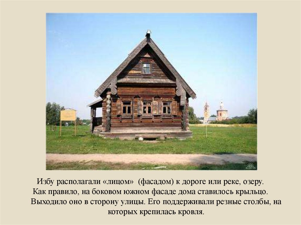 Избу располагали «лицом» (фасадом) к дороге или реке, озеру.Как правило, на боковом южном фасаде дома ставилось крыльцо.