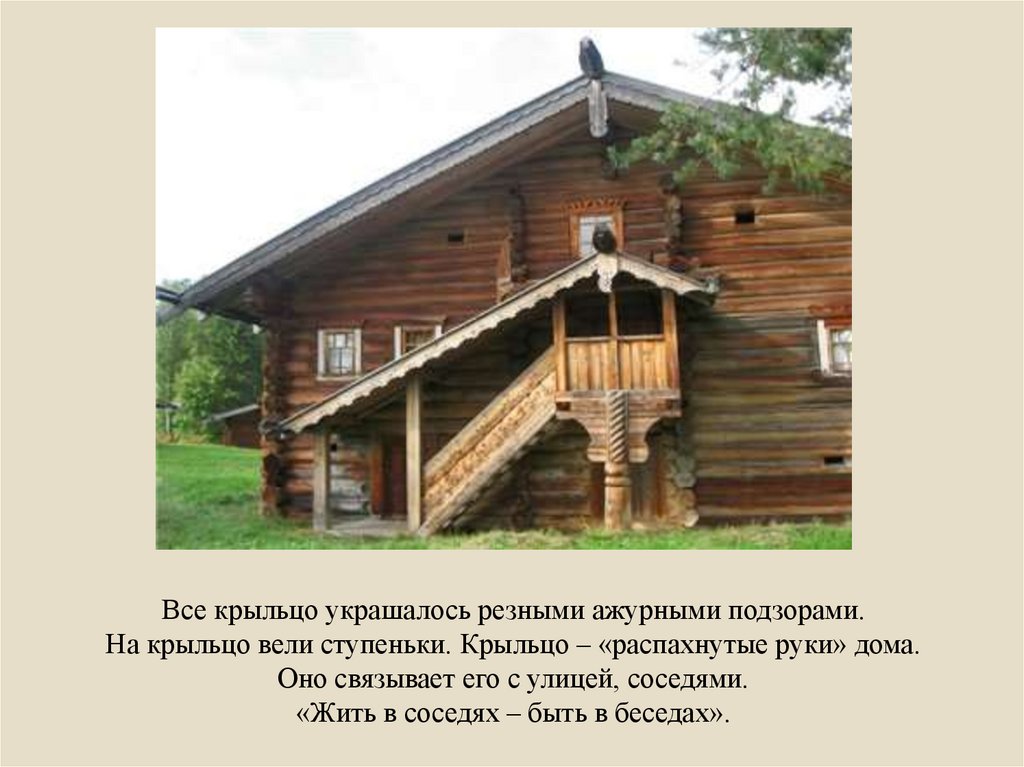 Все крыльцо украшалось резными ажурными подзорами.На крыльцо вели ступеньки. Крыльцо – «распахнутые руки» дома.