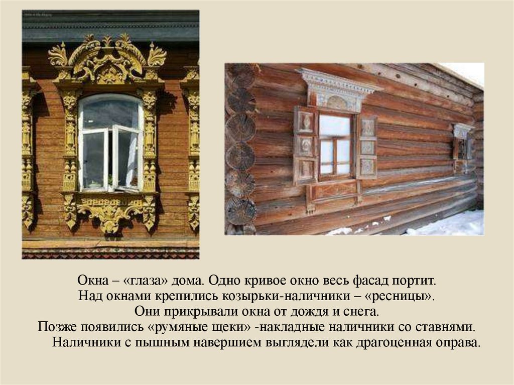 Окна – «глаза» дома. Одно кривое окно весь фасад портит.Над окнами крепились козырьки-наличники – «ресницы».