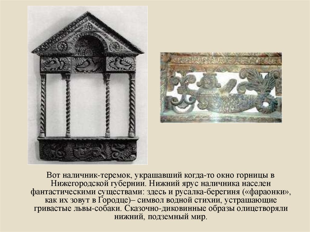 Вот наличник-теремок, украшавший когда-то окно горницы вНижегородской губернии. Нижний ярус наличника населен