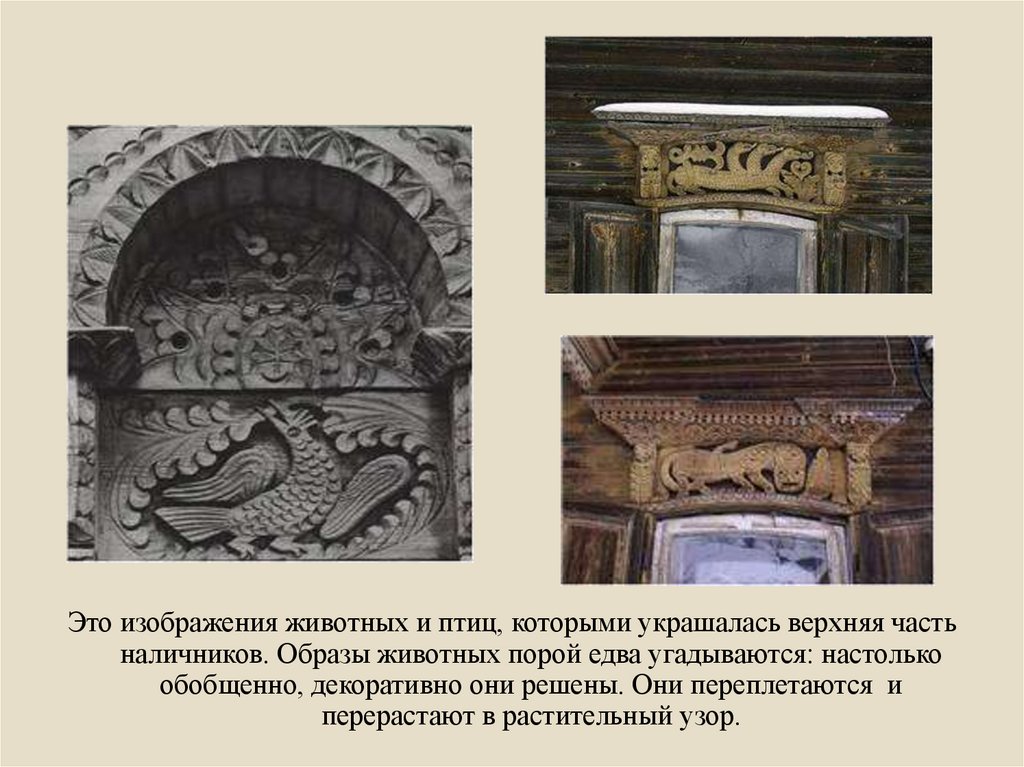 Это изображения животных и птиц, которыми украшалась верхняя частьналичников. Образы животных порой едва угадываются: настолько