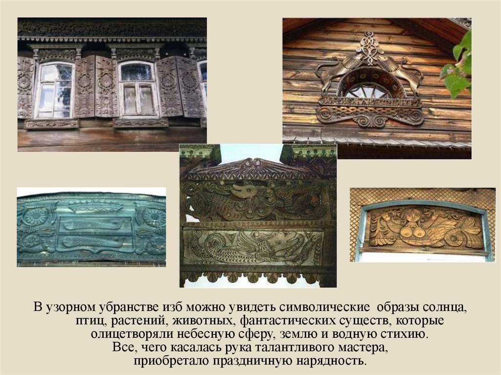 В узорном убранстве изб можно увидеть символические образы солнца,птиц, растений, животных, фантастических существ, которые