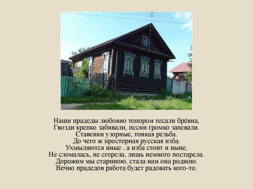 Наши прадеды любовно топором тесали брёвна,Гвозди крепко забивали, песни громко запевали.