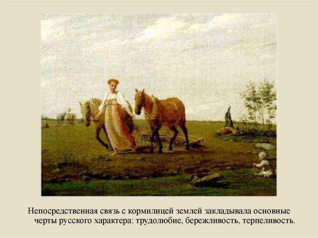 Непосредственная связь с кормилицей землей закладывала основныечерты русского характера: трудолюбие, бережливость, терпеливость.