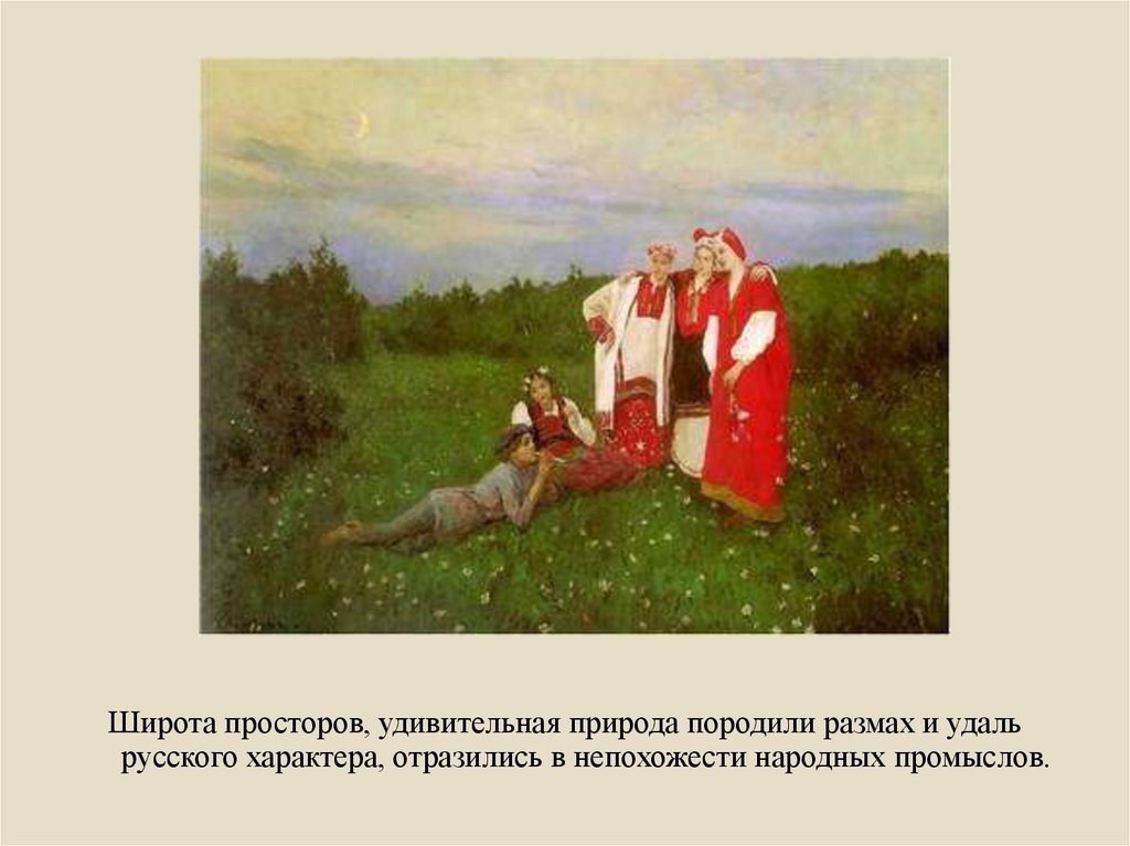Широта просторов, удивительная природа породили размах и удальрусского характера, отразились в непохожести народных промыслов.