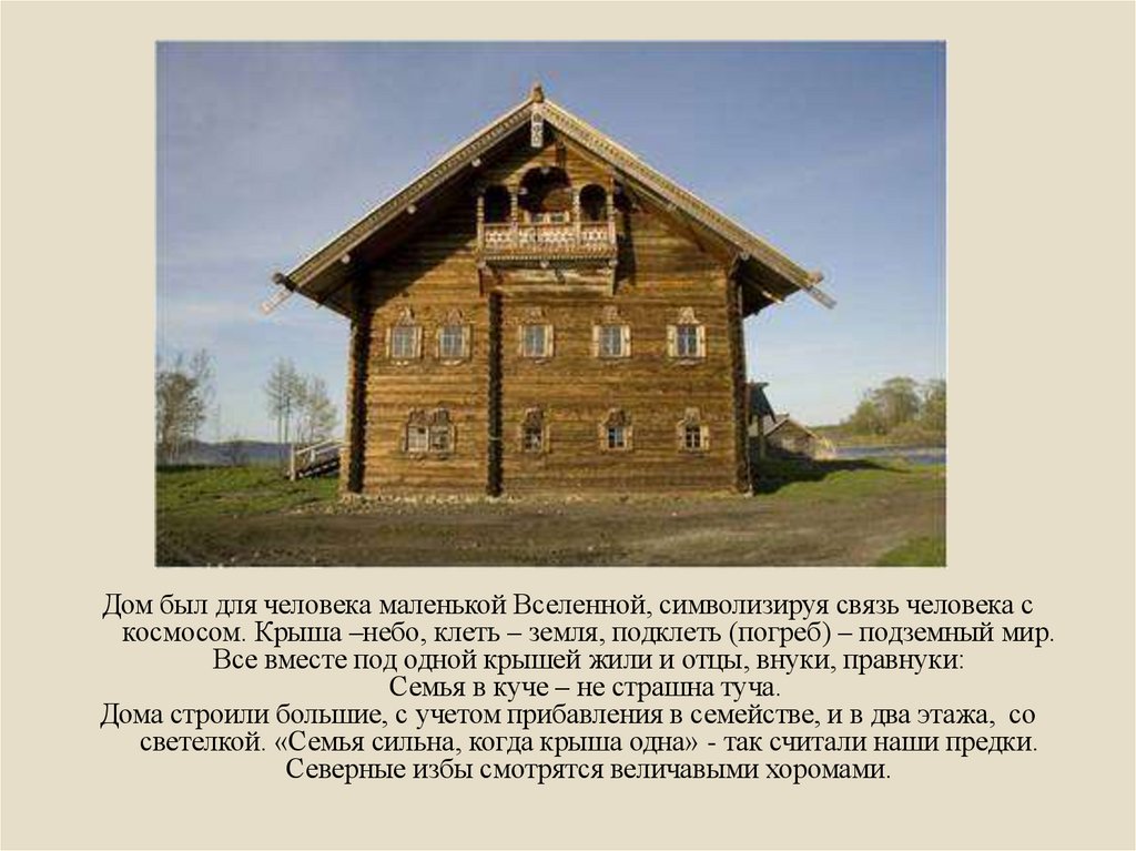 Дом был для человека маленькой Вселенной, символизируя связь человека скосмосом. Крыша –небо, клеть – земля, подклеть (погреб) – подземный мир.
