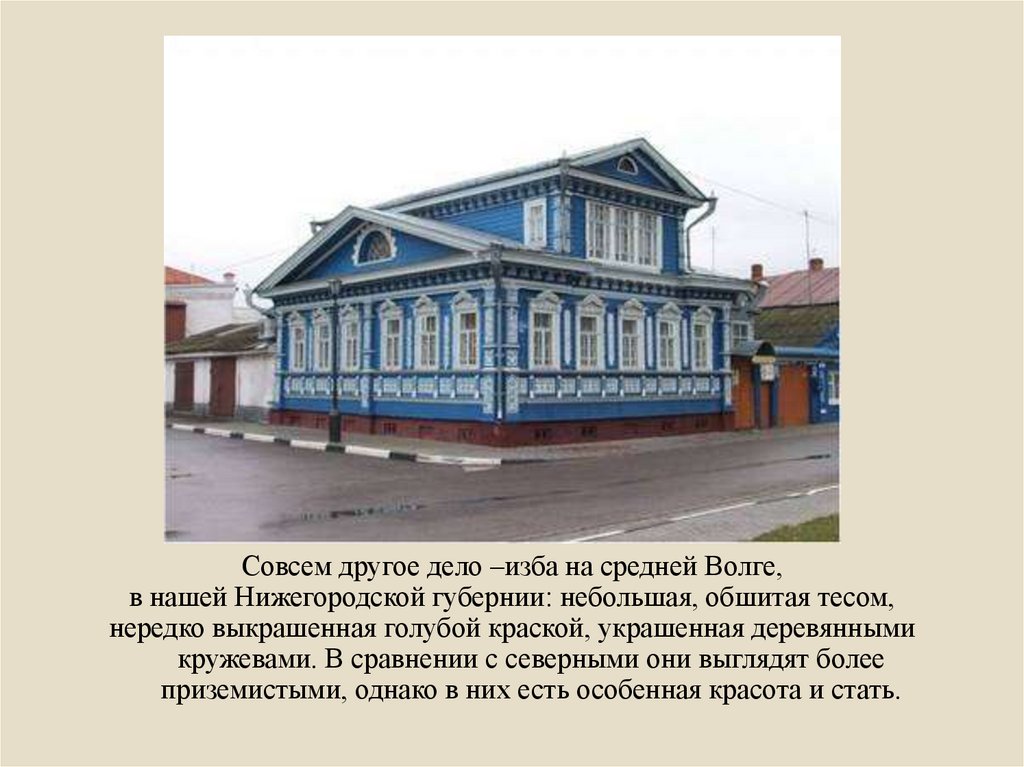 Совсем другое дело –изба на средней Волге,в нашей Нижегородской губернии: небольшая, обшитая тесом,