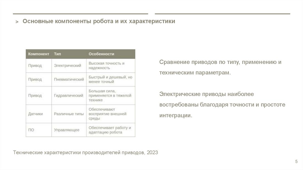 Основные компоненты робота и их характеристикиСравнение приводов по типу, применению и