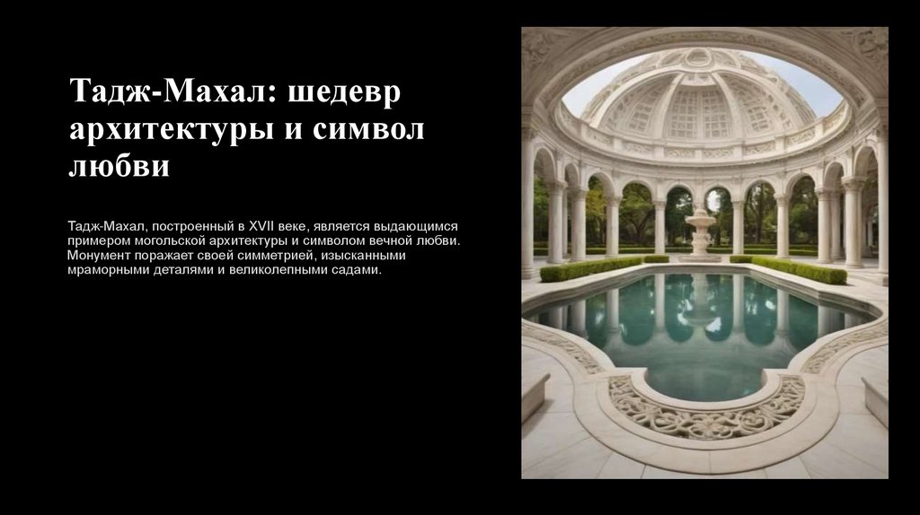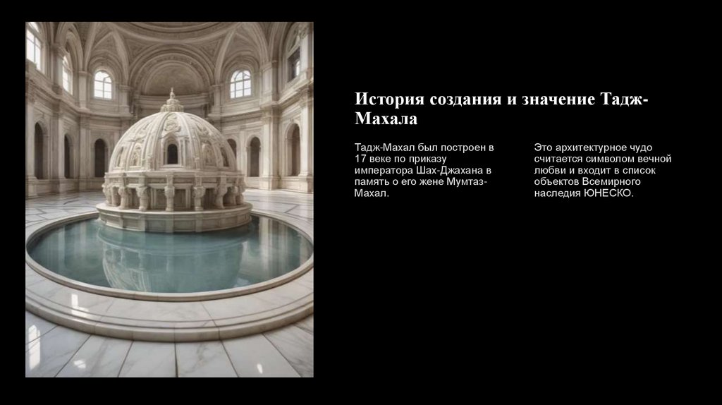 История создания и значение ТаджМахалаТадж-Махал был построен в