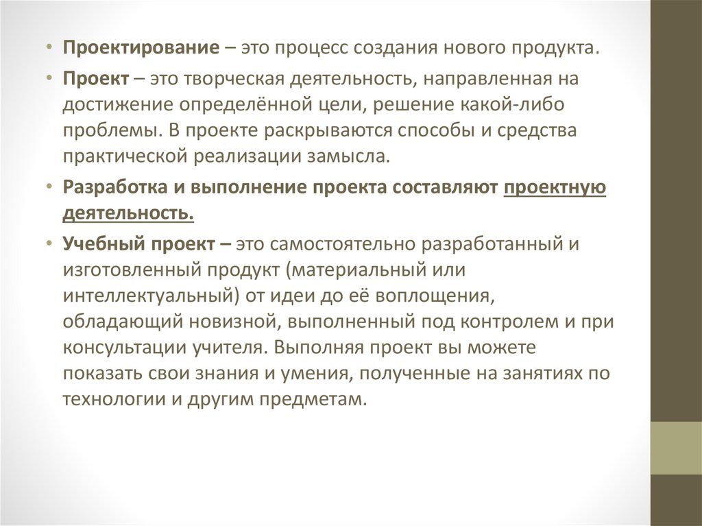 • Проектирование – это процесс создания нового продукта.• Проект – это творческая деятельность, направленная на