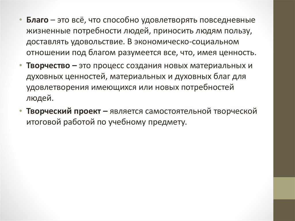 • Благо – это всё, что способно удовлетворять повседневныежизненные потребности людей, приносить людям пользу,