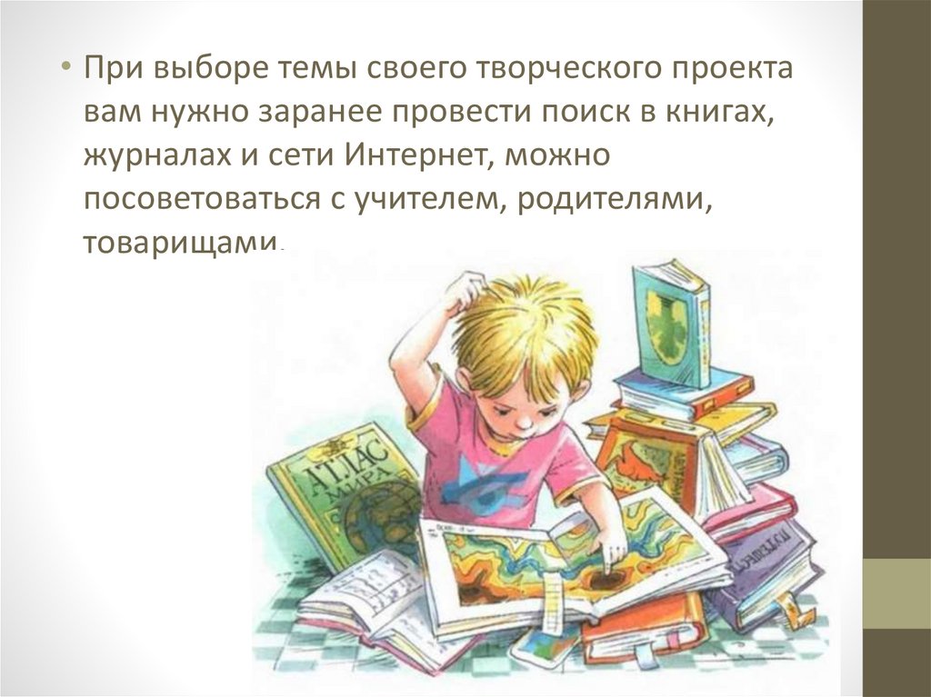 • При выборе темы своего творческого проектавам нужно заранее провести поиск в книгах,