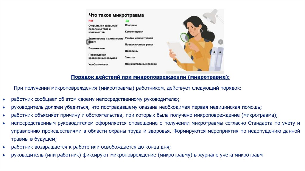 Порядок действий при микроповреждении (микротравме):При получении микроповреждения (микротравмы) работником, действует следующий порядок: