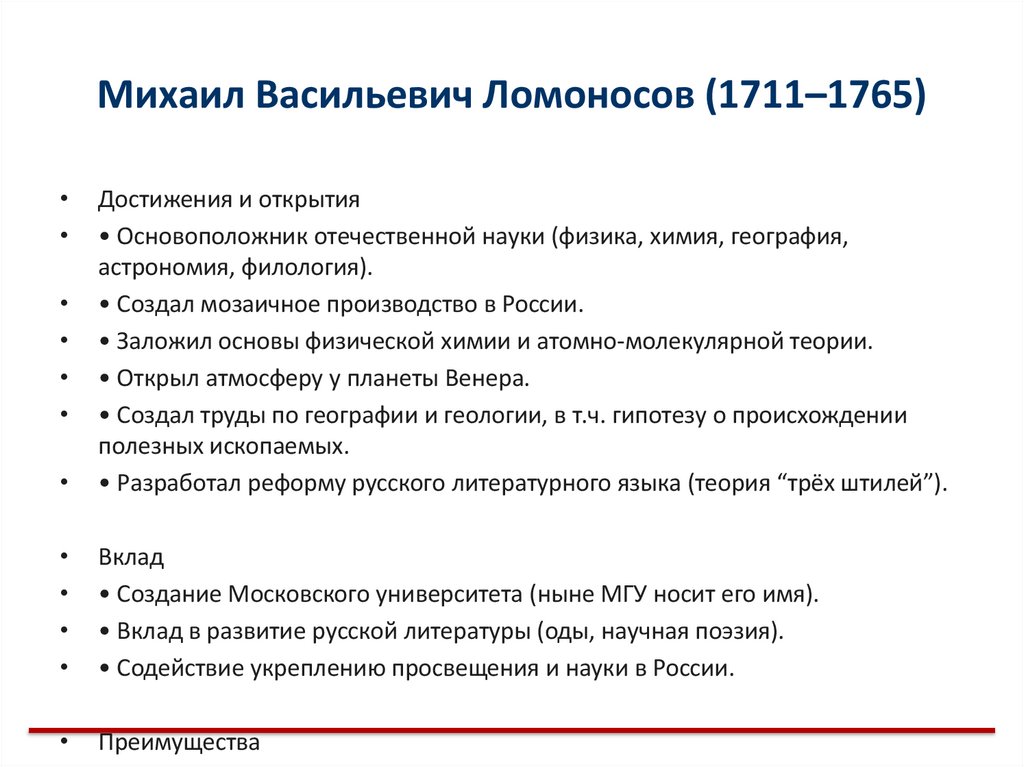 Михаил Васильевич Ломоносов (1711–1765)Достижения и открытия