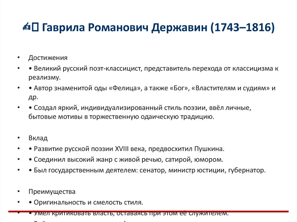 • Великий русский поэт-классицист, представитель перехода от классицизма к